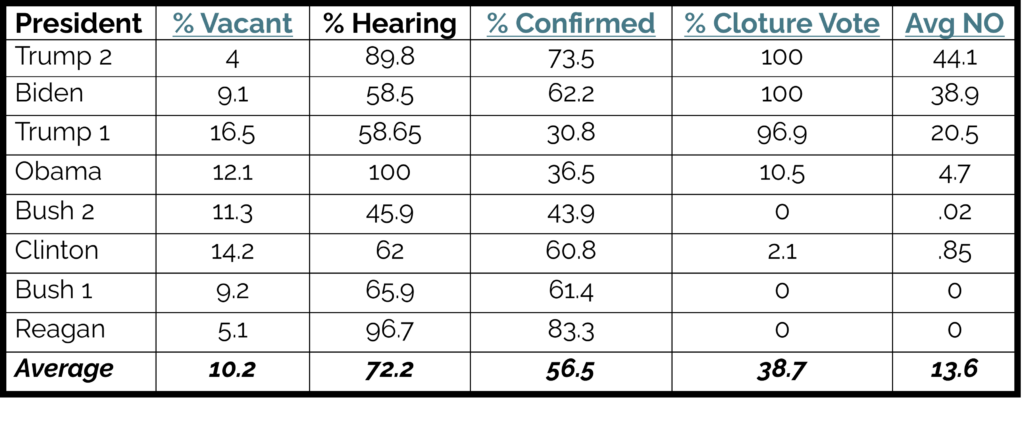 Article I gives Congress authority to create “Tribunals inferior to the Supreme Court” which also require presidential nomination and Senate confirmation. The current Article I tribunals are the U.S. Court of Federal Claims (16 positions), U.S. Tax Court (19 positions), U.S. Court of Appeals for the Armed Forces (five positions), and U.S. Court of Appeals for Veterans Claims (seven positions). Judges on these tribunals serve for 15-year terms. Data in this Judicial Appointments Memo are for judges on Article III courts.
