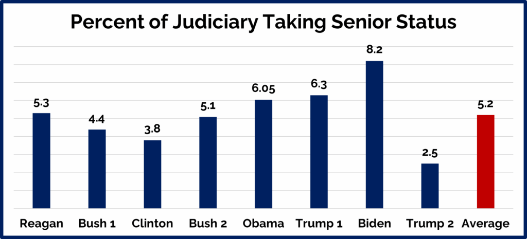 Senior Status: Judges qualify when they reach 65 with at least 15 years of federal judicial service, opening their position for a new appointment. 28 U.S.C. §371 requires that, to maintain senior status, judges have at least a 25% caseload or perform substantial judicial or administrative duties. Senior judges handle about 20% of the cases in the federal judicial system.