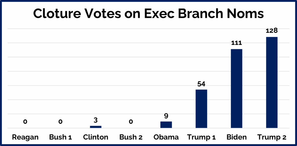 - Forcing separate votes under Senate Rule 22 to invoke cloture, or end debate, before voting on Cabinet nominations began in President Trump’s 1st