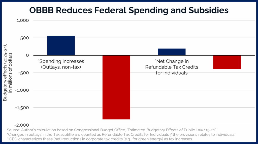 The One Big Beautiful Bill (OBBB) reduced the projected growth of federal spending and cut corporate subsidies in the tax code. At the same time, it increased funding for the military, homeland security, and the judiciary.